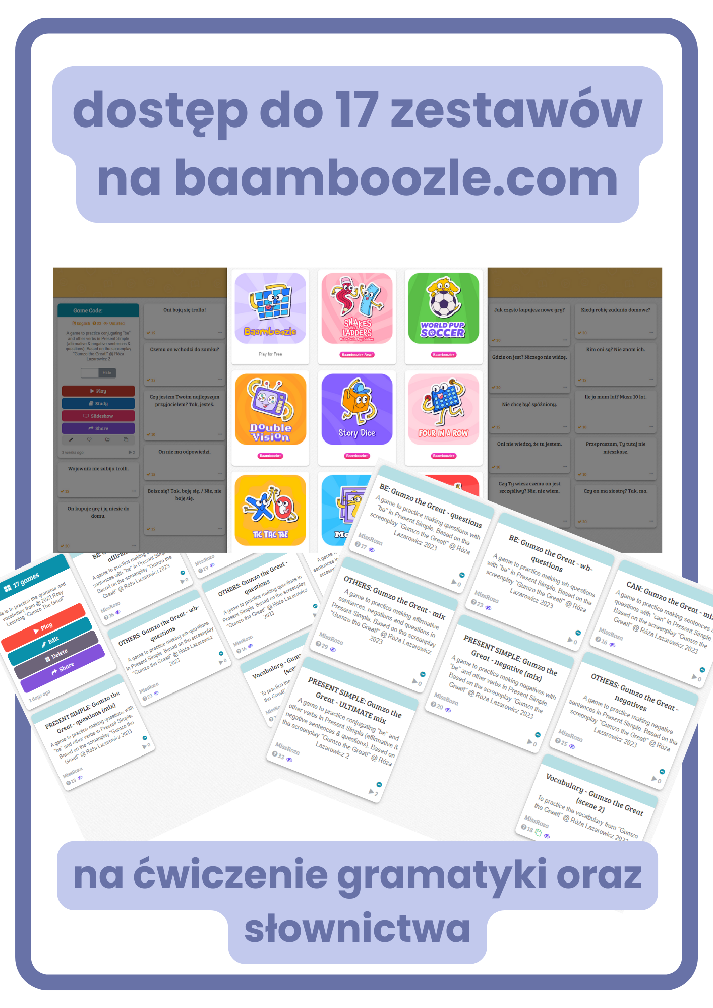 - aż 14 zestawów na Baamboozle do ćwiczenia gramatyki oraz