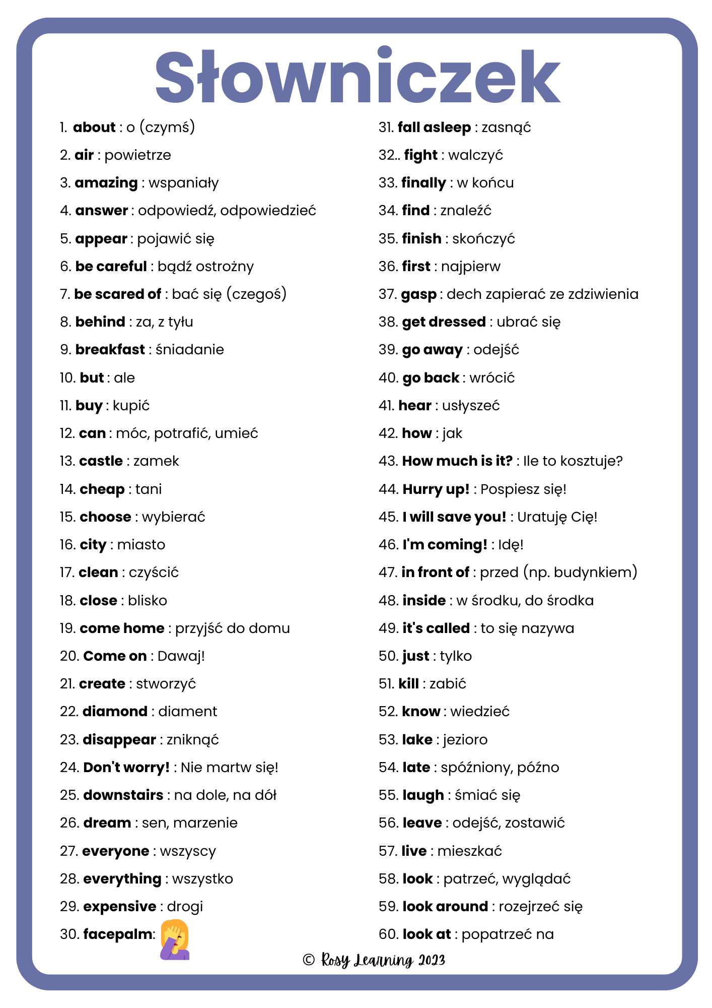 - słówka takie jak question, answer, behind, expensive, cheap, laugh, lake, shout, suddenly, downstairs, itp.