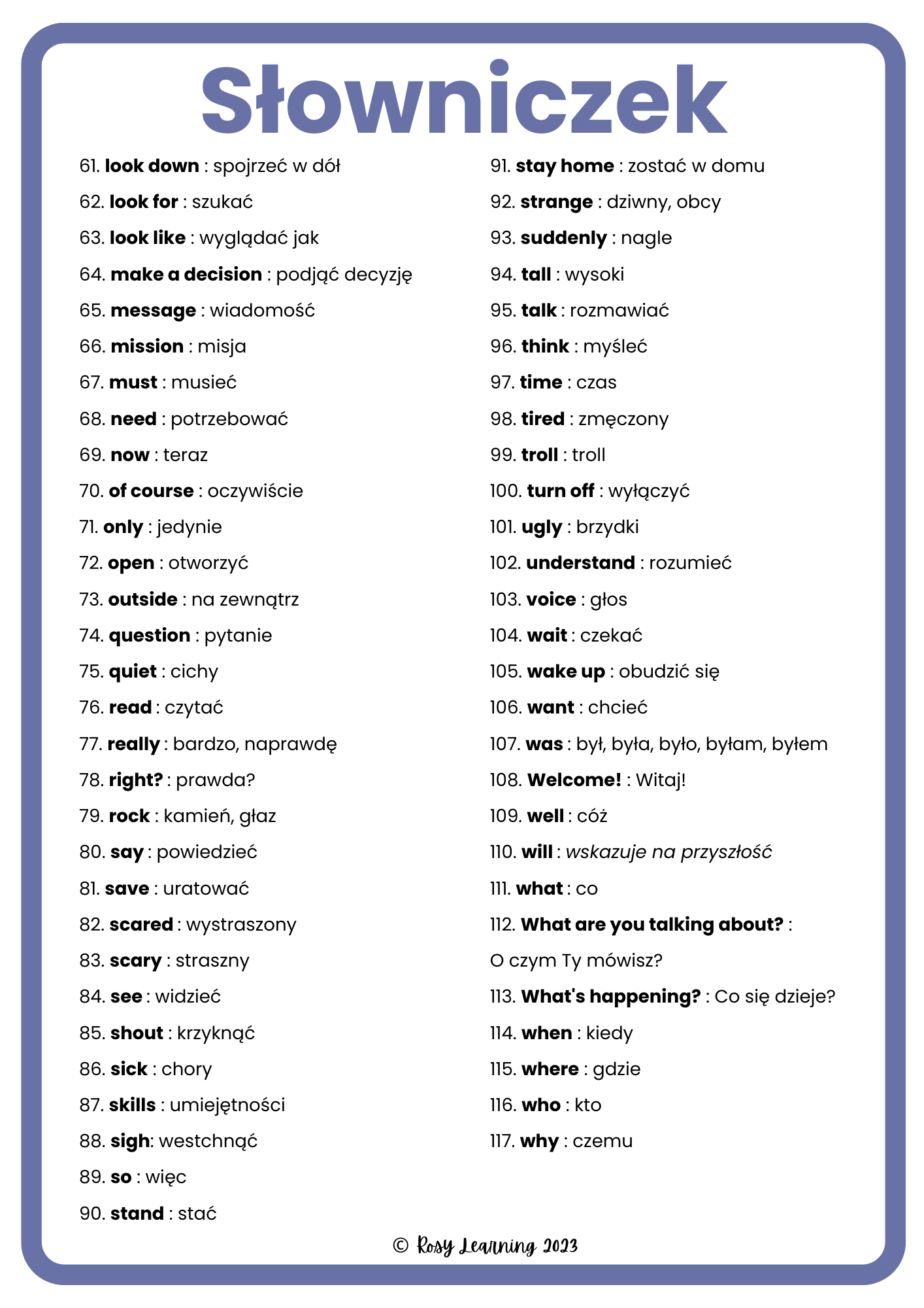 - wyrażenia takie jak be scared of, look for / at / down / like, fall asleep, get dressed, come home, be careful, it’s called, make a decision, itd.