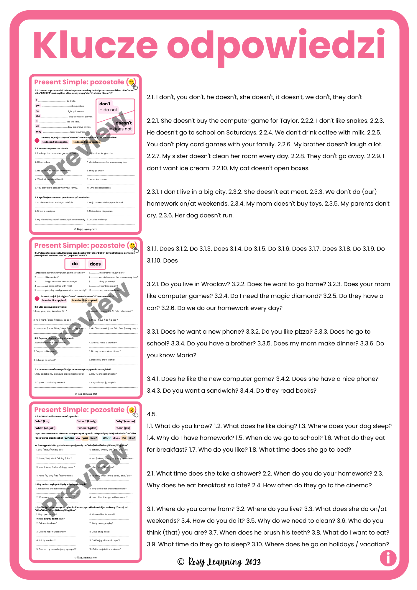 - klucz odpowiedzi z poglądem każdej strony,