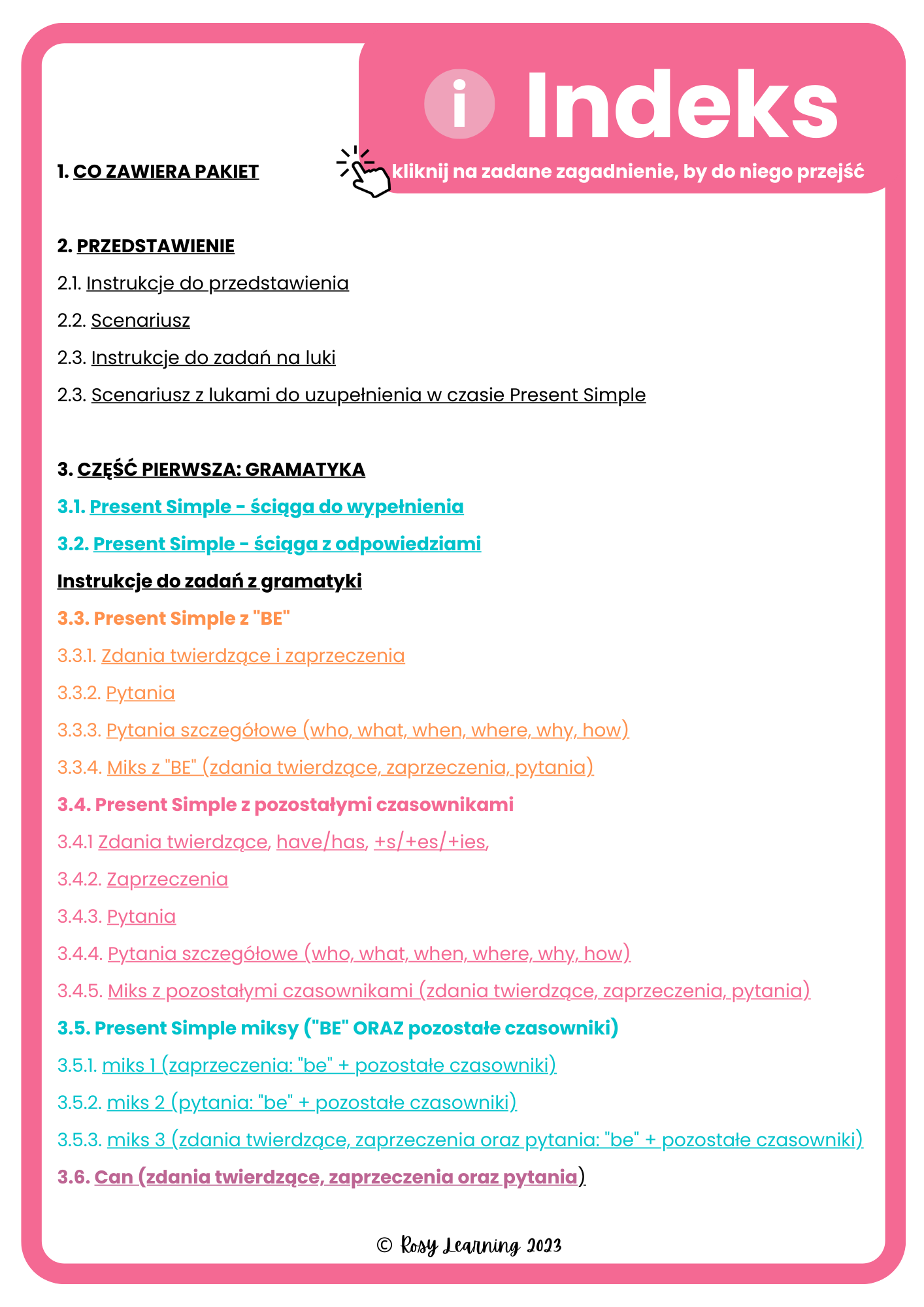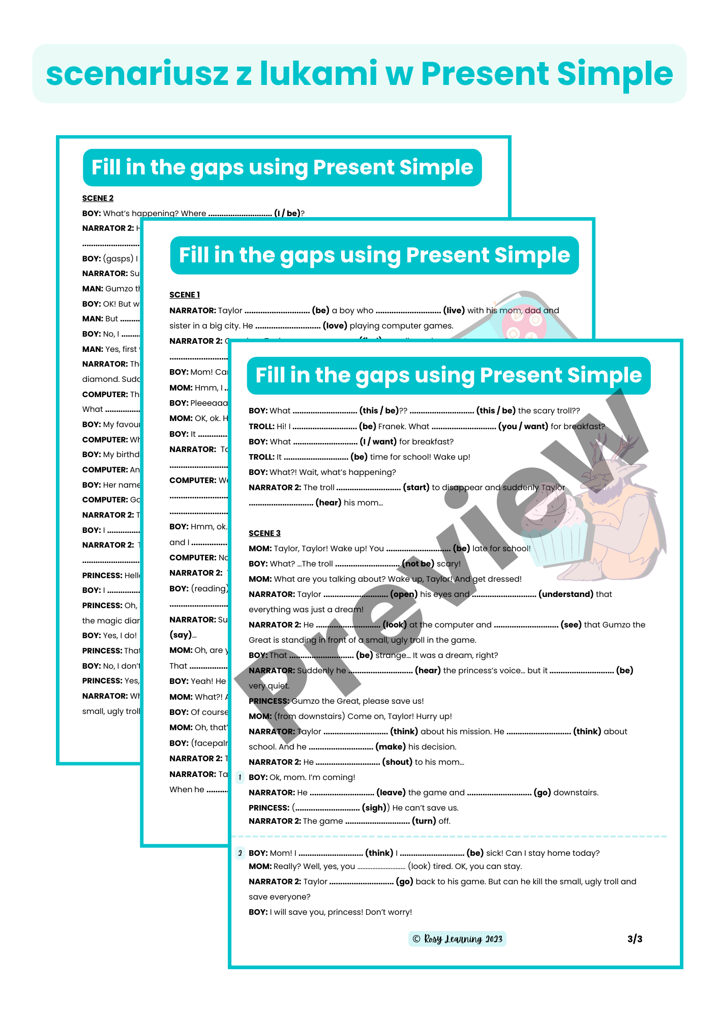 Pakiet „Mówię po angielsku: Present Simple” to materiał przeznaczony głównie dla uczniów klas 4-8, który pomoże Twoim uczniom (Twojemu dziecku) opanować m. in. czas Present Simple nie tylko w zadaniach gramatycznych ale również w rozmowie dzięki scenariuszowi przedstawienia oraz licznym grom!