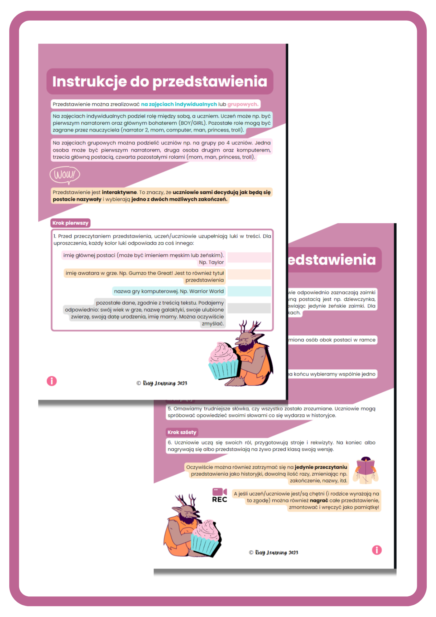 - instrukcje do odegrania przedstawienia, wykonywania poszczególnych zadań,