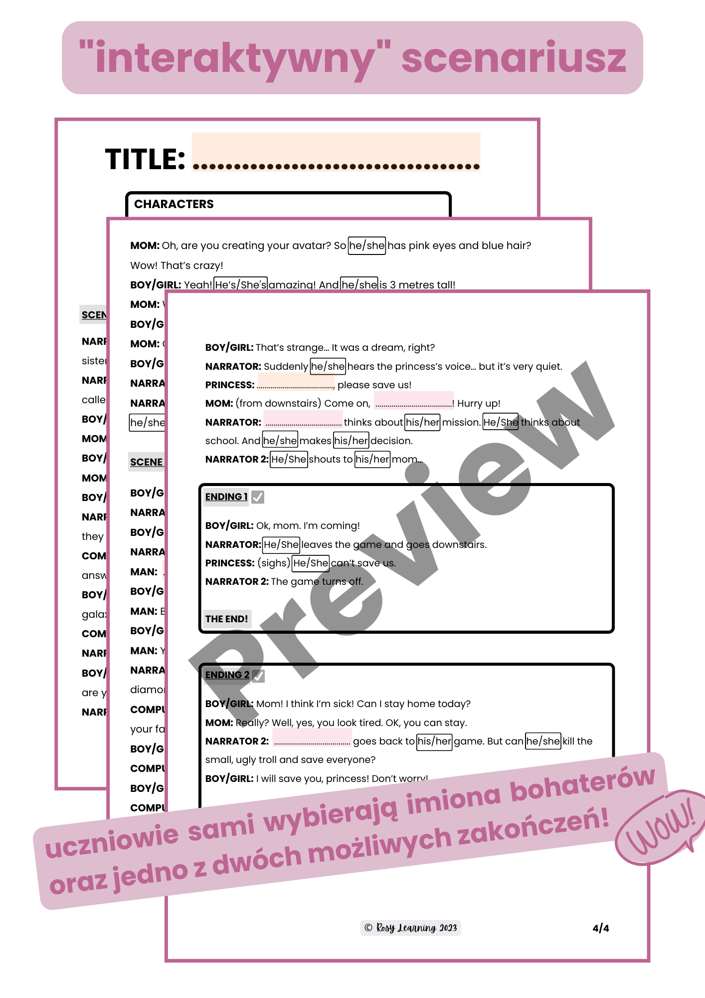Scenariusz jest „interaktwny”. To oznacza, że uczniowie mogą sami wybrać sobie nazwy postaci, miejsca zamieszkania, wieku, oraz inne odpowiedzi na zadane w dialogach pytania. Mogą również wybrać spośród dwóch różnych zakończeń przedstawienia. Opis historii: